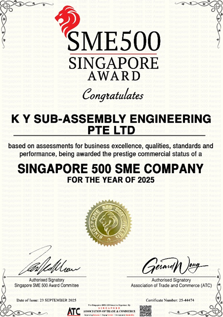 In September 2025, KY Sub-Assembly was honoured to receive the SME 500 Award, one of Singapore’s highly regarded business awards that recognises leading Small-Medium Enterprises (SMEs) across different industries and trade sectors. This award reflects not just our well performance and effort, but also the trust placed in us to be one of Singapore’s leading SME that is capable of meeting the standards required from our clients. Receiving this award definitely affirmed our business position in the precision engineering industry, and it is a significant milestone in our entrepreneur journey. We would like to take this opportunity to extend our appreciation towards our loyal clients who trusted and supported us throughout the years. As we expanded our capabilities, we are more than ready to support your future projects with greater efficiency.
