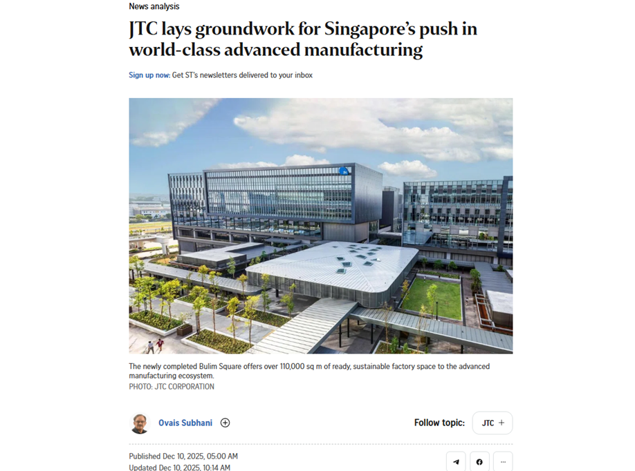On December 10 2025, The Straits Times featured Bulim Square in their coverage of “JTC’s Next-Gen Estate Signals Singapore’s Push to Lead in Advanced Manufacturing.” The article highlighted on how Bulim Square is contributing to Singapore’s position in world-class advanced manufacturing by providing a factory space for companies to thrive in the same ecosystem.